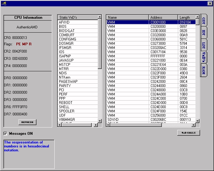 Perform at ring0 level. Shows how to operate at ring0 from visual basic several ways, int 20, calls and deviceiocontrol. Hopefully this program and the included documentation will help you in some way. GDT, LDT, IDT, status control registers and flags, VxD's, service calls all explained and with good documentation. Many examples in the program. Check it out.