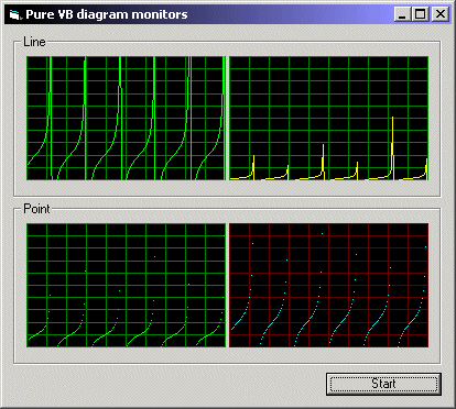 Ever wanted to display graphical information about CPU, memory or any kind of variables? Check the screenshot and you'll know what I'm talking about. This PURE VISUAL BASIC made control adds graphical diagrams to your Visual Basic application very easily!! Just under 10 lines of code, and you have very cool graphical diagram monitoring your variables! All colors can be set easily. Also includes many other options to fit your app. Is you find this useful, please vote me or give me feedback.