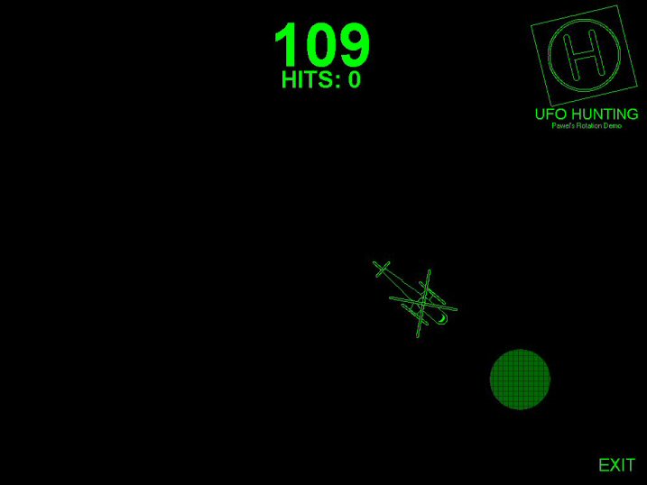 My UFO Hunting game shows that you can create rotations with just VB, and using pretty simple code. In the game, the helicopter follows your cursor, always pointing in its direction, and using the searchlight, you try to spot the "UFO" (the black circle moving around on the screen), and click it to get points, all in 120 seconds. Just for fun, I included some cheats. To have a two-bladed helicopter, type "double" and to have slow spinning rotors, type "slow." Enjoy, and please vote!