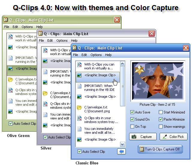 Q-Clips 4.01 is a Windows Clipboard Extender that enhances and extends the Windows clipboard by remembering all items (text, graphics, color numbers and files) that are copied to the clipboard and storing them in a collection for later pasting... even after you shut off your computer. The program also features a built in Screen Capture tool, with magnify window, so you can capture any portion of the screen, the desktop, or active window, and send the contents to Q-Clips. While you work in your editor, word processor, graphic imaging program or virtually any Windows program, Q-Clips sits in your windows system tray... capturing all data that is copied to the Windows Clipboard. When you need to access those clips press the system wide HotKey... click on the desired clip and it will automatically paste into your program. Many features and options including saving Images as JPEG, multiple capture types, color themes and a color capture tool. For details on all features and their use view the Q-Clips Help Manual included in this upload and available from the Q-Clips Help Menu. (Ver. 4.01 Update: Added View Color Tool to view actual color of captured color number and more. Please see readme.txt file for all Update History Details.)