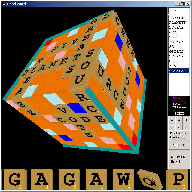 A one-player 3D scrabble™ game using DirectX7. Has a 250,000 word dictionary (plain text). Will check and verify the words. Uses standard scrabble™ rules and scoring - except you can build words around corners. It is lots of fun. To Play, simply click on a letter in the 'rack' and then rotate the cube and click the space you want to place the letter.