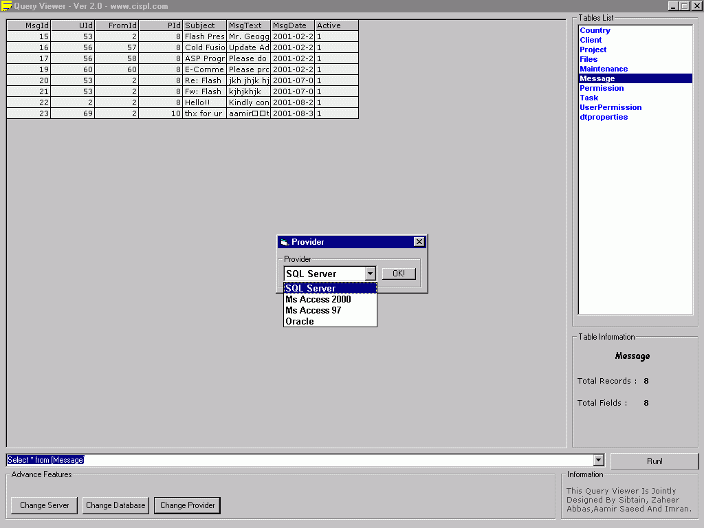 This is a Multi Database Query Viewer which supports SQL Server 7.0 , Ms Access 2000 , Ms Access 97 and Oracle(which will be available in next ver) Databases . You can write the query and view the results on the grid. It also gives you some information of tables. You can change provider any time. Plz Vote!!!!!!!