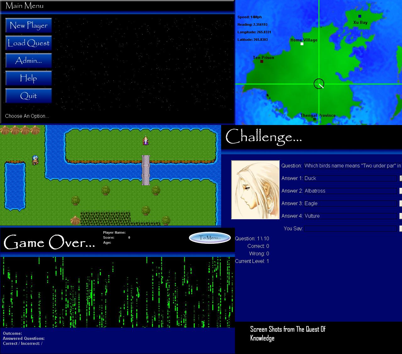 inputs, this game features an rpg map engine, an interactive quiz that takes questions from an access database, a very user controled wrld map which includes a brilliantly simple but affective physics engine (some maths involved)