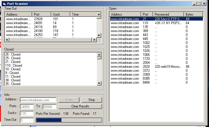 Pretty Quick Port Scanner.. u can load up to 175 socks.. i made that max cause i can acuretly scan remote adreses at about 115 ports per sec on may cable inet . (win xp, xp 1700, 512mb) .. so im not sure how it will work on slower comps/inet.. has selectable timeout so u dont have to wait for winsock. , Timothy - IntraDream.com