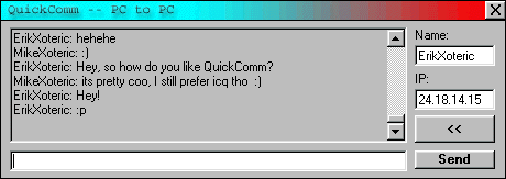 QuickComm PC - PC is a UDP Communications program using the MSWINSCK (Microsoft Winsock) control. With an IP address and a Name, this program allows you to communicate to other users on the fly, without having to set up a connection. Useful for people with cable connections who like to have communications with friends. :) In addition to the simple communications allowed, QuickComm also slides up when not in use, much like an Auto-Hide Taskbar. If incoming data is displayed while hidden, a sound is played, then a small Incoming Message window is displayed at the bottom-right corner of the screen until the user views the incoming text. Download it and check it out. :) If you're looking for help on UDP protocol with Winsock, it's fully commented. If you're just looking for a quick way to talk to someone, it's reliable. Erik Forbes NiftySoft