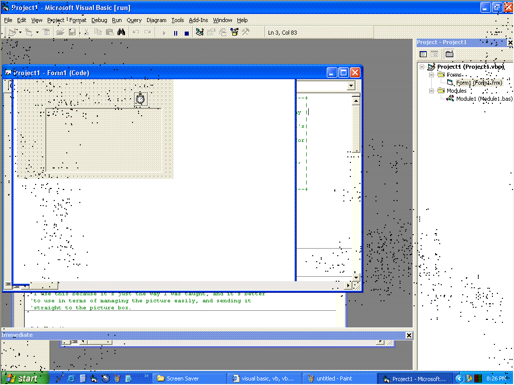 This code basically shows a beginner how to use a screen snapshot command in applications using one methood, and a couple of things that involve picture boxes to draw dots in a random sequence.