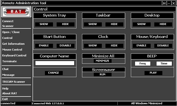 RAT is an advanced utility developed for network administrators to track and control over the network computers. it had coded in simple and effective way using VB 6.0. it contains server and client program. server will be handeled by admins and client will be running on client machines. it uses basic winsock control. it's special among other tools are