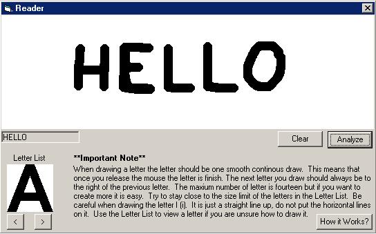 This program can read!! Draw in a word and then it reads what u have typed. A full explanation of how it works is explained in the program. Its very good and pretty acurate most of the time. I have also just created a program that reads the mouse movements instead of the picture this method is a lot faster but less acurate!