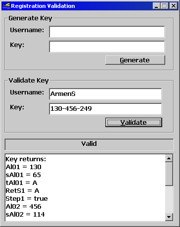 A little app that I made to generate a key according to username. Also this app will validate the key. This is a little bit more advanced. Most validation routines actually take the username that is put in, and generates a key for that. Then it will compare that and what the user entered. This leaves a big security hole because anybody with memory editors can actually use the actual program as the keygen. My app actually reverse engineers the key into a username then compares usernames. =) have fun and change it as you like. Also, please vote!