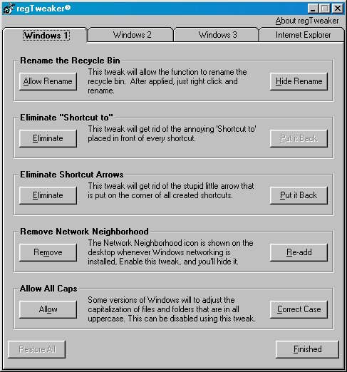 This really isn't an update of the program, rather an update of the description. Last one didn't really say what the program does. It is made for Windows 98, however some of the tweaks have been tested and work on 95/NT. It modifies lets you easy modify over 20 registry keys, that improve looks, or rid of annoyances. Check it out and please vote, and leave feedback!