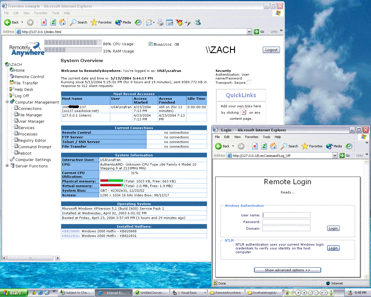 This program is basicly a server that sits on a remote machine. By simply typing the IP address into the internet explorer address bar. it will require you to login with a username ane password. This update containes streaming processes. I also added a connection monitor. Along with other updates the login page is now more secure............................................................................................REMEMBER!!!!!!!! you must change your security options to allow you to use active x components. i have some oages use the activex winsock component...............