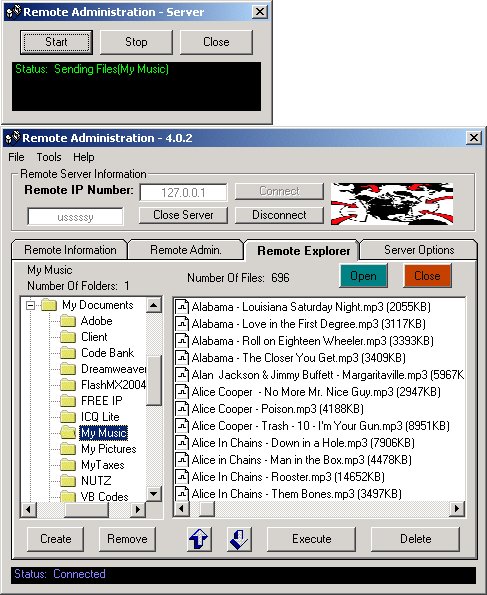 Administer a remote computer via LAN/WAN/Dial-Up. Code is complete with no bugs (that I'm aware of.) The server comes complete with an "options" form that can be accessed by right clicking the server icon in the system tray. There's just WAY TOO MUCH for me to even begin to explain what all it does ... view the screen shot about the remote explorer. I don't care if you vote, but PLEASE comment. This is definitely not an original idea, but I believe it's one of the better ones. (BTW TY to all the authors who have helped me with my code and suggestions.)