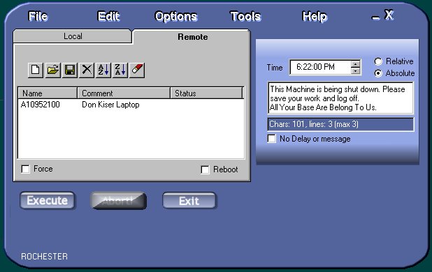 This application will allow an NT Administrator to remotely shutdown a NT workstation for which they are a member of its local adminstrator group * You can shutdown two ways one that is absolute (5:00 PM) or delayed (10 minutes from now) * A shutdown message can be displayed * A forced immediate shutdown can be implemented (user gets no warning) * Running applications on client can be allowed to close or terminated immediately * Time delayed remote shutdowns can be aborted for any or all computers on list * Note for Win 95/98 users: Remote shutdowns are not allowed through Win 95/98 machines. XP/2000 is untested. There's alot of code in here and its relatively well commented but there may be redundant API declartions, etc. The code has been tested and works. I haven't test cross-domain shutdowns however. Use this program at your own risk. Author assumes no liability for its use or misuse. There's alot to this code, have fun.