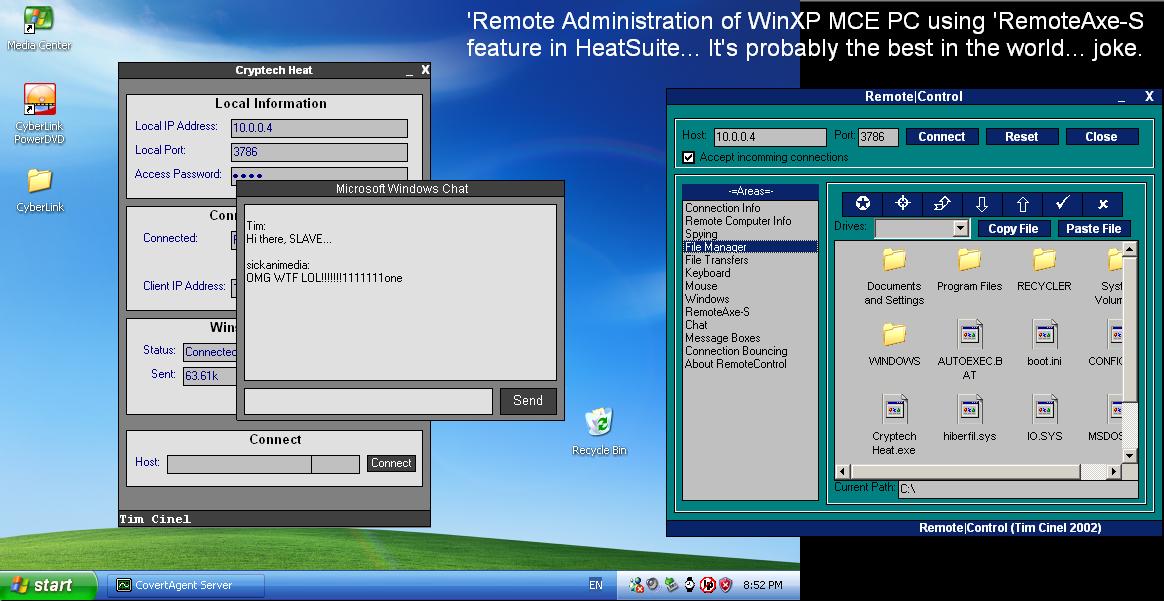 You can have multiple servers and manage them through IRC, you can log keystrokes and user activity. There is a file browser that allows you to browse, shell, delete, download and upload files remotely. You can use the server as a proxy server, and bounce/tunnel conneetions. You can popup message boxes or request user input. Chat communication can be initiated between server and client. Keystrokes can be sent. Individual windows can be manipulated (hide,show,change caption, bring to front)