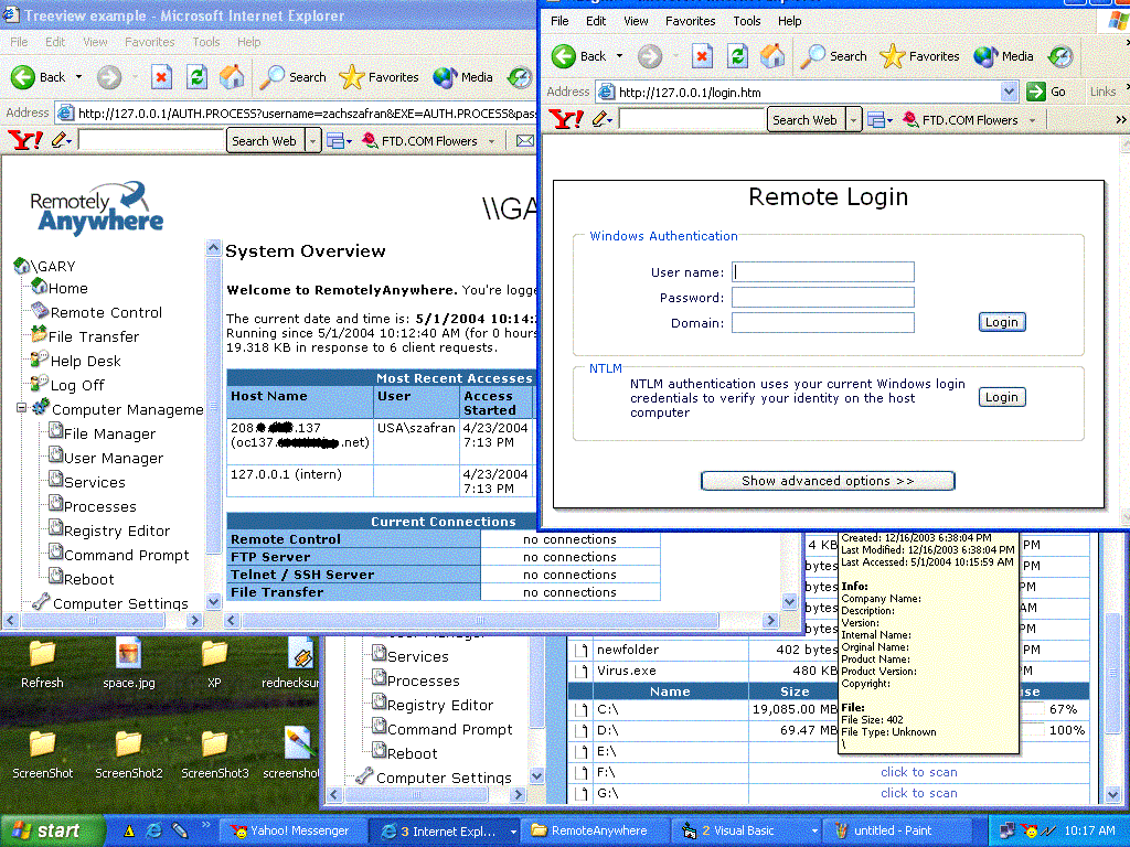 This is a replica of the RemotelyAnywhere program. This is unfinished.... i put a lot of functions into this project. The filemanager and the command prompt work. The this program is started on a computer you can connect to it through Internet Explorer simply by typing in the IP address to that machine.... After doing so a loging screen will be displayed.... this in return will allow you to browse that computer. There is a great layout included in this along with Javascript and vb script..... please tell me what you think and feel free to add more onto this project....