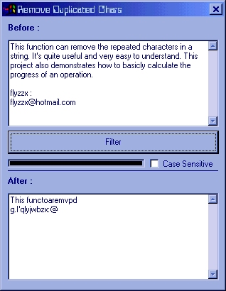 This project demonstrates how to remove the repeated characters in a string. A progress bar is included so you can know the progress of the operation. Great for beginners. VOTE IT IF YOU LIKE IT! THANKS!