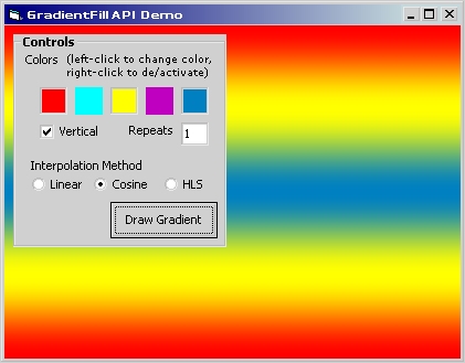 **Yes, I propose we rename VBC to Planet-Gradient-Code! Like an infant I am oddly fascinated by pretty colors. In this submission I use the GradientFill API function to create horizontal and vertical repeating multicolor gradients. I also provide a custom gradient fill function to implement smoooooth cosine and tacky HLS (rainbow) color interpolation.