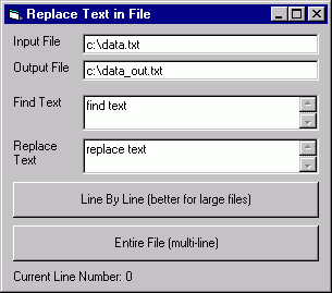 This is a very simple program, but it works tons faster than Notepad's (and many other programs') replace for large files. Note: The "Entire File" option allows replacing text accross lines, but requires reading whole file at once, so it won't work well for large files. Possible enhancements would be multi-file support, file open dialogs, command line options, etc. I may add some of these features if requested or if I find use for them.