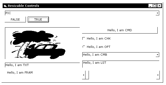 This code implements a module I have written that allows nearly ANY control to be resized at run-time. This would be handy for something like dynamic form design or something of that liking. I am not sure if anyone else has ever done this on VBC before and if they have, I am sorry. In this example I have implemented the module on 9 controls (can be used on many more, I just don't have the time). I am sorry that the screenshot is black and white, though it saved in the wrong format. I hope this helps.