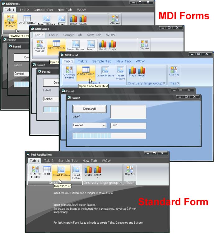 (UPDATED 19-Dec-2006) "Ribbon 2007" is a copy of the Ribbon Bar from office 2007. Created using as base the Full project "Office 2007 Ribbon" (https://VBCode.com/vb/scripts/ShowCode.asp?txtCodeId=66698&lngWId=1).