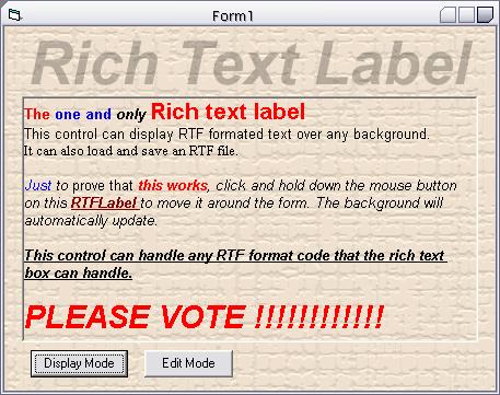I created this because I am making a WYSIWYG editor and there is NOTHING on VBC that does this. I will admit there are some atempts but nothing I have seen comes close to this. Bascially this control BitBlts the form image under it into a picture box, then it BitBlts the rich text over it. VOTE PLEASE