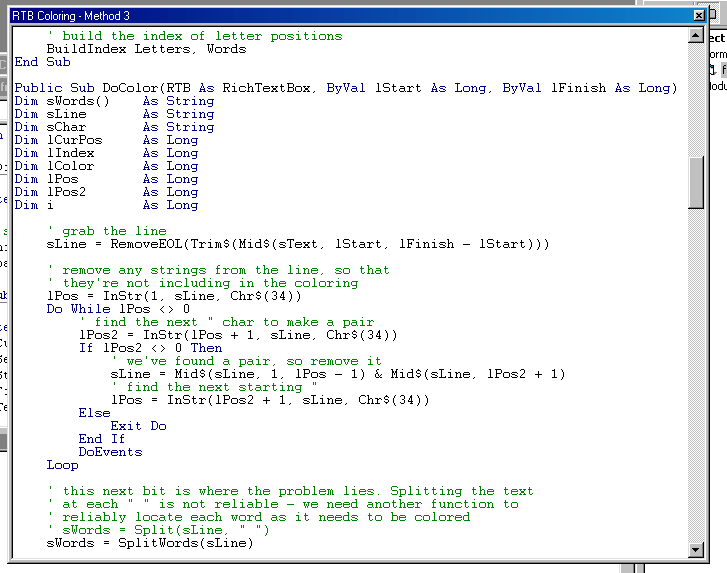 The purpose of this text is to attempt to answer the incessant queries on coloring text in RichTextBoxes. There is no magic command to do so, unless of course you have purchased a third party control from somewhere or other. There are plenty around, and some are cheap, some are not...