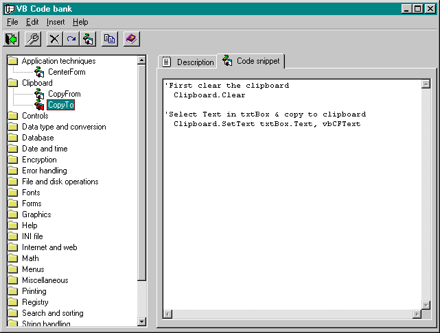 Rick's codebank is a simple application which, I believe, would be a good learning tool for beginners. When I was first starting out with VB it was nearly impossible to find a complete working project to learn from. Books and manuals talk all around a subject but never really show you how to do anything practical. They give you a few snippets of code, but never a project complete enough to give you the big picture.
