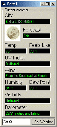 This control when added to your VB app will grab the current weather from the net. You can control how the output will look.