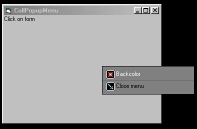 This application demonstrates a customized popup menu, with a "rolling" (vertically scrolled and gradually revealed) effect. It works by using a second form embedded within the first as the popup menu. For more code samples visit my personal web site: click above on my full name.