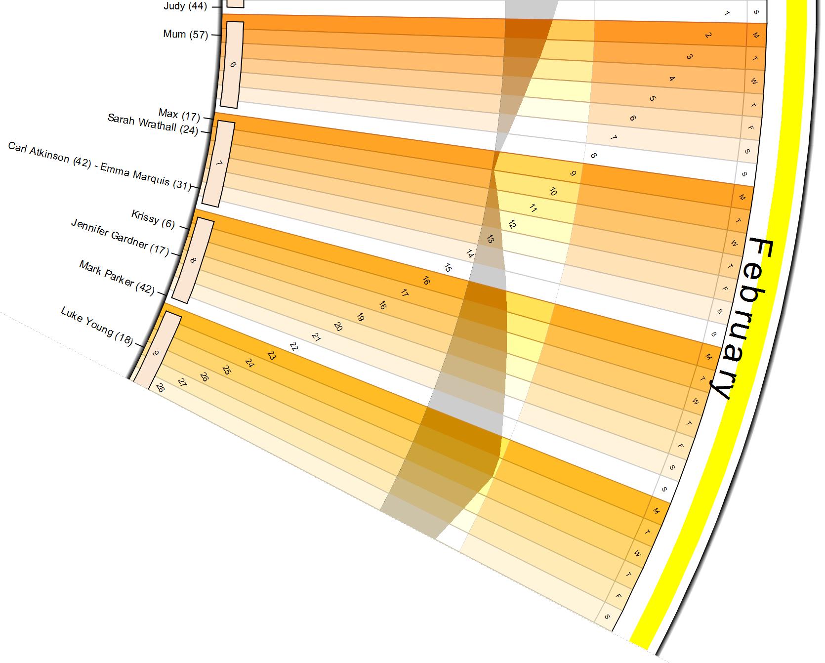Create (print) a large wall round calendar. Some code borrowed, their name should be in the BAS files. Some information taken from Microsoft Outlook and printed on the calendar too.
