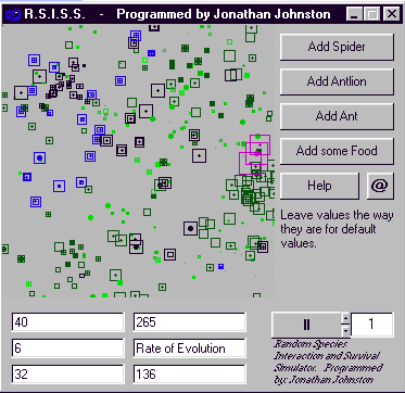 you input the amount of Ants, spiders, antlions, food, the rate of evolution and the refresh rate.
