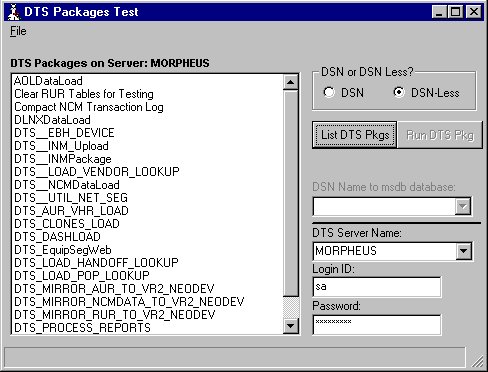 UPDATED - 12/07/01!!! This kind of goes against my article earlier this this week. In a new environment I was able to do two things. I was able to query a list of DTS Packages from my Server and then execute a chosen Package remotely. This can be easily modified to accept collections and remotely fire multiple Packages on a timer (which is what I'm using it for). If you downloaded the zip file earlier you may want to download it again since I've updated it and revised some of the references.