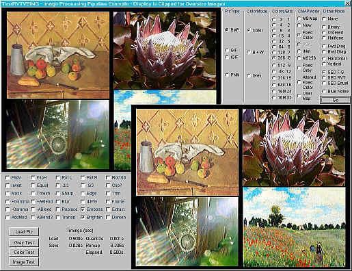 Image Processing in VB. A complete rewrite of the 2001 version. Read all uncompressed BMPs, GIF, JPG and PNM files. Write BMP, GIF and PNM files. Also capture/return external Bitmaps and StdPics. Extended Color Depth/Palette options. Dithers enhanced. New Blue Noise Dither. More than 20 new operations - including alphablending and color combination, Sharpen, Blur, Edge, Equalization, and color correction. Particular support for very large BMPs >16M in size. The compiled .dll is many times quicker than in the IDE. Apps using previous (2001)version will require checking and recompilation.
