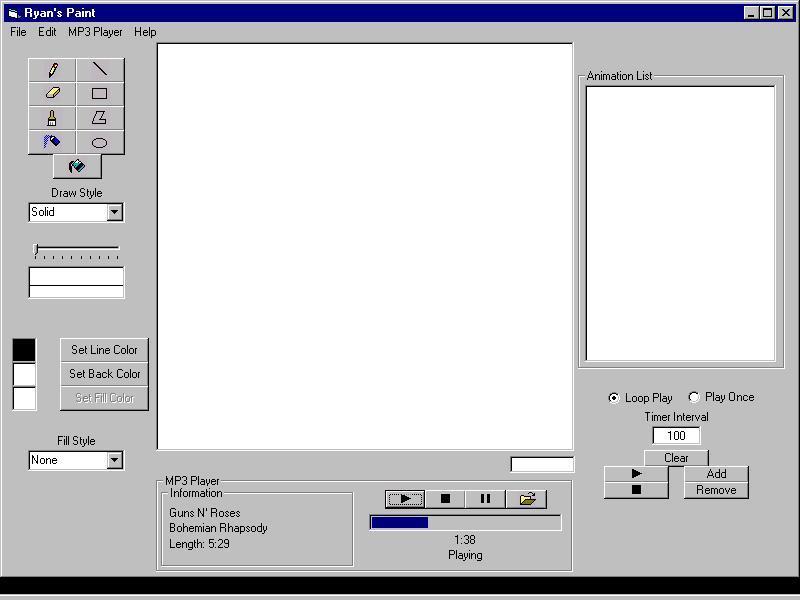 UPDATED AGAIN!!! I fixed it so that the progress bar isn't jumpy when trying to change position. It has a built in MP3 Player. Pretty COOL. Along with the MP3 Player update I also put in something when drawing an ellipse or rectangle it shows the height and width and when you draw a line it says the length of the line. I put on the fill regions code at last, but the fill styles didn't work so I got rid of them. There are cursors(I think you will have to move the cursors to C:\Program Files\Microsoft Visual Studio\VB98\ or it will be an arrow), and I also put in something that shows the frame number when you are playing the animation, and I made the animation list have numbers. Choose the style of animation. This paint program has the basics: rectangles, ellipses, paintbrush, freehand, spraypaint, eraser, lines, and connected lines. You can save and load pictures. There are also animations, and you can save and load those too. You can select the draw style and draw width also. You can also print your picture. It also lets you undo your last action. This program has it all!! Please comment on program and tell me what it needs. I hope you enjoy it and PLEASE rate the code.