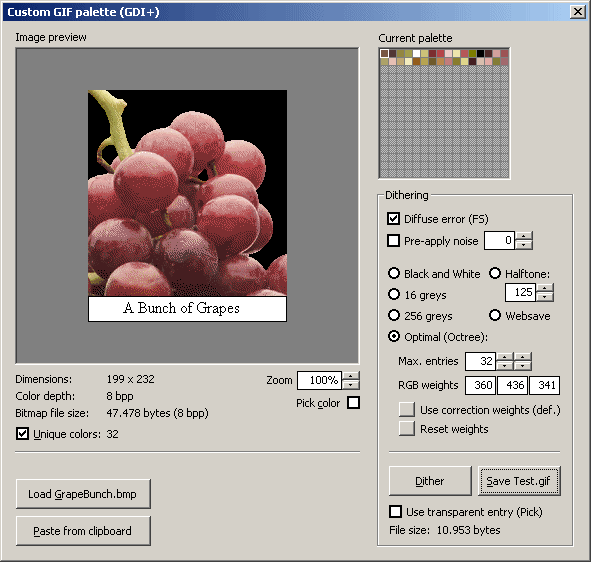 Save custom palette GIFs using GDI+. This is a basic application, nevertheless you can easily extend it. __________________________________________________ Zip 92Kb (Screenshot done using this code) __________________________________________________ Last update: 2003.03.13