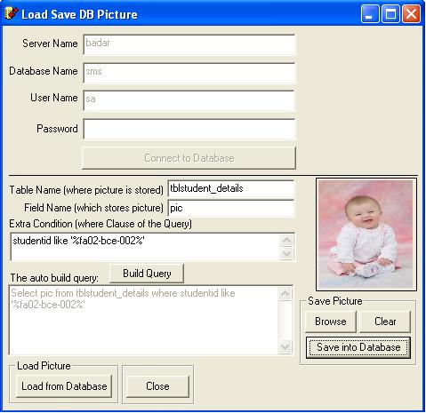 First to connect with the SQL Server, four information need to be provided. Server Name, Database Name, User Name and Password. Then Press "Connect to Database" button. After successful connection, provide information to build a successful query. The information required are: Table Name (where picture is stored), Field Name (of that table which holds pictures in binary form), and any "Extra condition" to be placed in WHERE Clause of the query. "Build Query" button will show the actual query built on your provided information. These information are required to Load and Save Pictures in Database.
