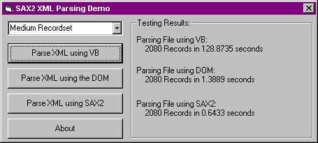 This demo will be useful for those who are interesting in learning about XML parsing in VB, and especially useful for those who want to take advantage of Microsoft's new MSXML SAX2 technology. All the VB wrapper classes you will need are included with this demo.