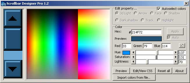 Sets scrollbar colors for HTML pages. Includes a color picker with RGB or hue/saturation/lightness support. Easy click and select interface. Generates complete CSS code. Also shows correct color on the track when no track color is selected. Includes a preview with a real internet explorer control.