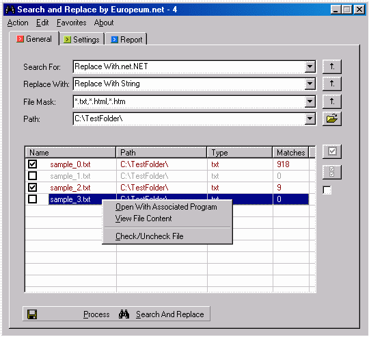Search and Replace is a search utility that can find and replace one or more strings in multiple files. Operations are done using regular expressions. You have a lots of options too choose from. If you like it please vote.