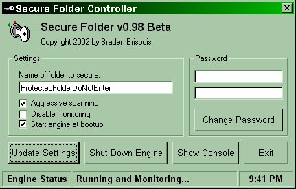 Must be compiled for all functions to work correctly. Place the SEENGINE.EXE under C:\WINDOWS\SYSTEM and place the SECUREFOLDERCONTROLLER.EXE anywhere you want.
