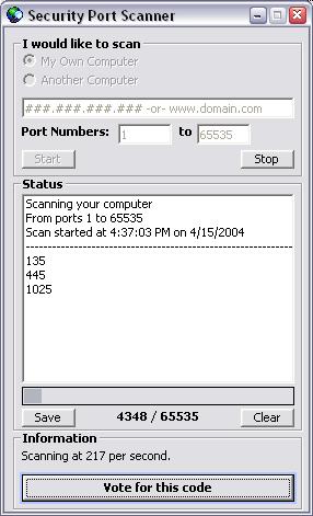 Security Port Scanner can check for open ports on your own or a friend's computer. You can specify what ports to scan, and they will be added to the listbox when a successful connection has been made. A recommendation message box will popup if any open ports are found on your own system to install a personal firewall, but that will only happen once if you dont care. Security Port Scanner is high speed, and has scan rates of over 200 ports per second on local scans, and 100 ports per second on remote scans. The computer I tested this on was a 1.4 GHZ Celeron with 128 RAM using Cox Cable Internet, so your results may be diffrent. I hope this will help you out, I have seen many slower and less efficent ones here on vbcoders.com. Votes and feedback appreciated.