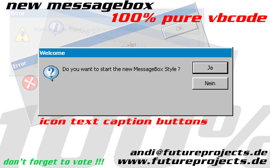 This is the new MessageBox 2.0 !!! Fully customable !!! Easy to implemented !!! Use instead of MsgBox : MessageBox . Same Paramteres!!! and don't forget to vote !!!