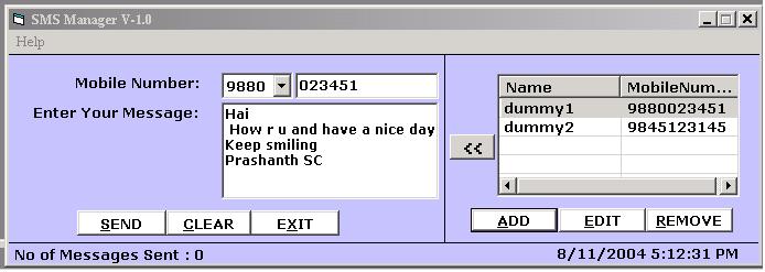 U can Send SMS without any registration to any of the provider.SMS-Sender is provided with contacts options where u can store ur friends name and Number which u can use at the time of running.Very Easy of Sending sms ..just select the number and type in the message and Clicking Send..Button done.It uses MSWINSCK and msmapi ocx..which is usally found in windows/system folder.If throws any error u can find these ocx availble on many sites.(address.txt file shud be used)..Any Suggestions and healthy criticism is always welcome..
