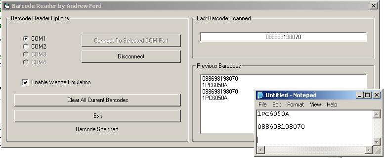 This project allows you to get a barcode from a serial barcode reader and put it into your applications, or another application using sendkeys. It uses the MSComm control and the OnComm event to read each individual character passed to the serial port, it detects the finished barcode from the carriage return sent by the barcode reader. This could be useful in epos programs or just to get data from the serial port.