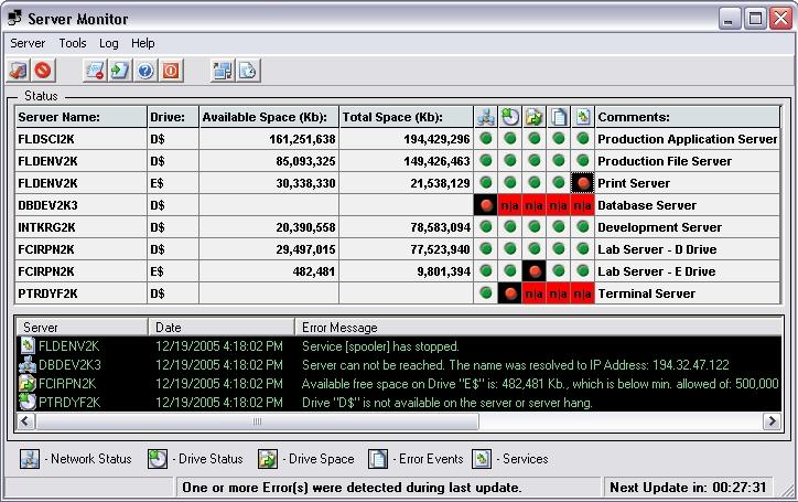 Server Monitor is a utility for Windows system administrators. The main purpose of it is to monitor and intercept error type events occurred on the W2K/W2k3 servers. Events such as Server is Down, Drive is not available, free space on the drive falls below preset limit are intercepted. Servers query interval can be set from 1 minute to 24 hours. Monitor can send an Email or Page (if available) with error summary. Optionally Monitor can intercept Error type events from the Application and/or System Log on servers.