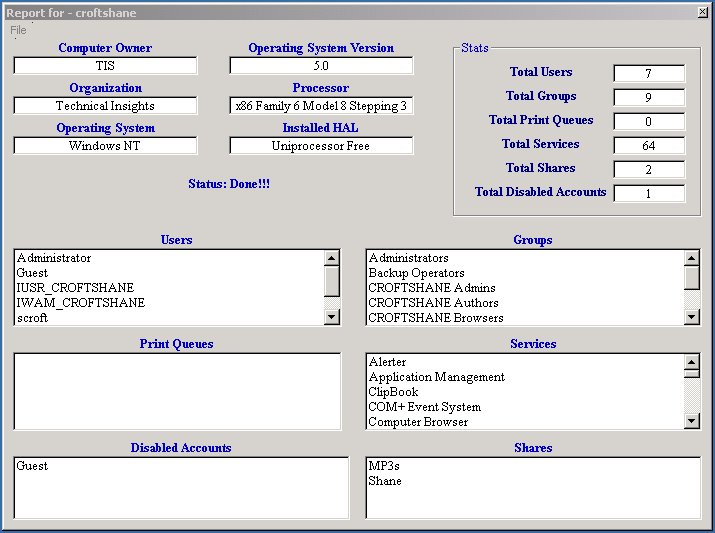 You must make sure you have ADSI 2.5 installed. This is free from microsoft. This program is for Windows NT and 2000 all versions. This will get some information on the server like users, groups, print queues, services, disabled accounts, and file shares. This code can be easily modified to get so much informtation that it could be one of the best out there. But right now it is basic. It also has a PRINT option to print out the report. Please vote.