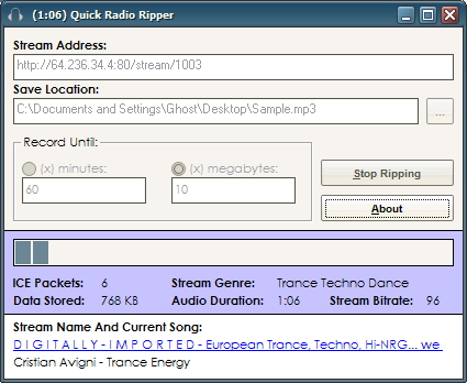 One of the best Shoutcast Stream-Ripping Applications available on VBC for Visual Basic. The Quick Ripper is capable of connecting to any specified shoutcast stream and downloading it - MP3 data only, no polluting ICE tags left over - and recording it to an MP3 file on disk. It can record until a certain time elapses, or a certain file size is reached. I've tested it with a 3 hour rip and it came out beautifully. It can be started from command line also, making it perfect for scheduling routine rips with your favorite scheduler software. Stream Buffering decreases the number of block writes to disk are required. Live Resync protects streams from becoming corrupted mid-run, the ripper will simply wait for the next ICE tag and use it to reanchor and resync with minimal audio loss. Entirely coded from scratch, capture routines revolve around straight winsock access.