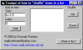 Demonstrates how to shuffle/rearrange items in a listobx (i.e. Moving an item "up" or "down" the list at runtime).