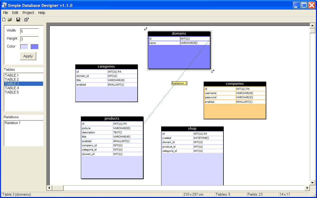 Simple Database Designer is an application witch you can use to create your one database models. You can create tables, fields and relations. You can export your database structure directly to a SQL script and you can export your database model to a Bitmap, JPG or GIF image file. You can move the tables with the drag and drop method. You can change the properties of the workspace (size, background color). You can delete tables, fields and relations. All relations witch are connected with a table you are going to remove will be automatic detected and removed. You can reorder the tables (foreground or background).