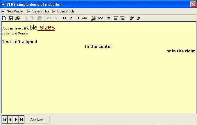 I needed a simple msword compatible text editor in various parts of my system. So I sat down one night and designed this ActiveX control which you can 'throw' into any form. You can even bind it on a database. No technology breakthroughs here. Just lots of time saving when you want your users to have some control over what they write and you want to save them exactly as they want. It uses the richtextbox encapsulated as an activex and so you dont have to write any code every time you need a simple editor. Just throw it in.